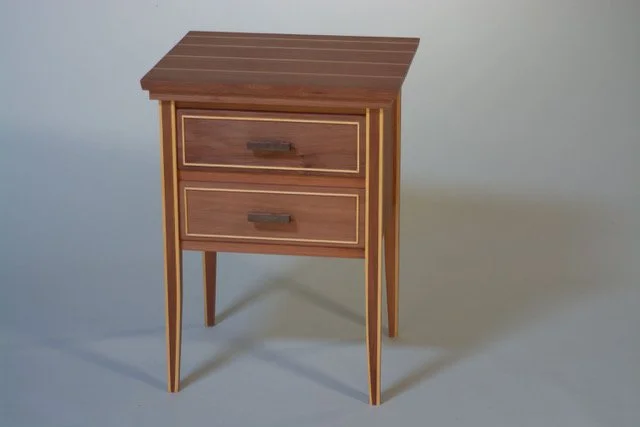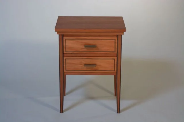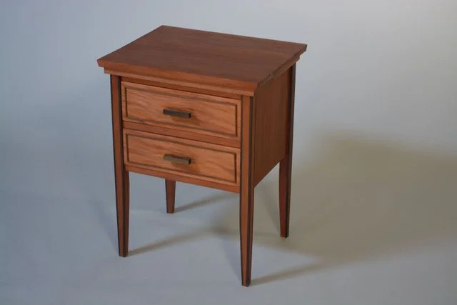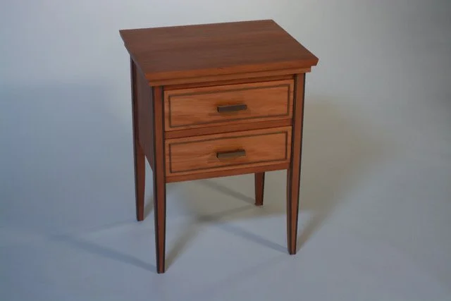 Bedside Cabinet Red totara, two drawers, detailing in either yellow heart kahikatea or black totara.Dimensons: 630 H